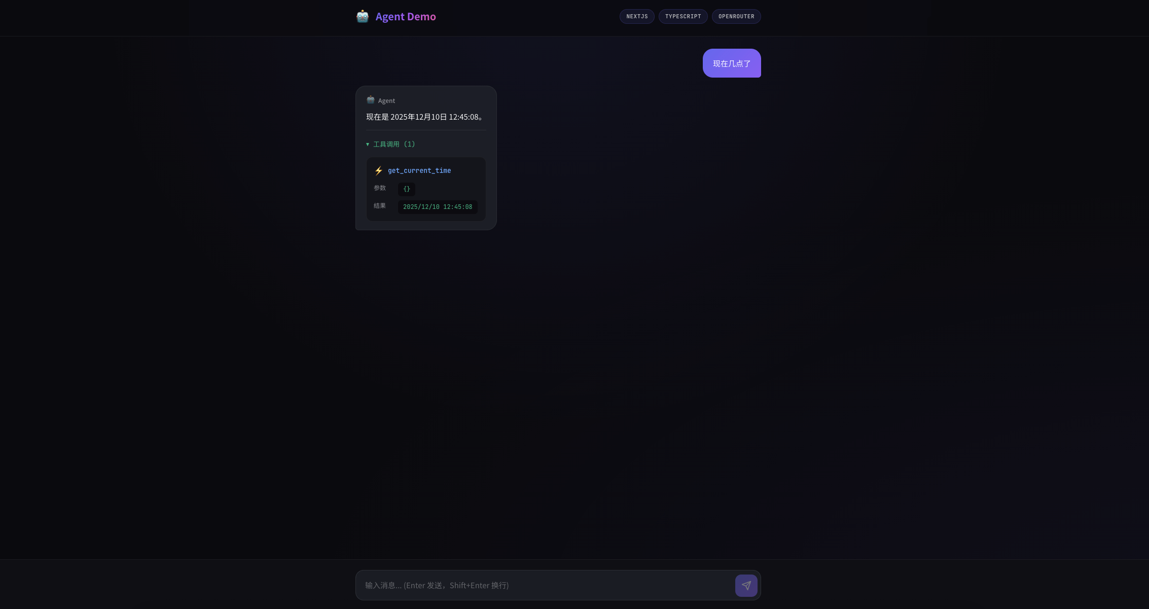 | agent-demo/ ├── app/ │ ├── api/ │ │ └── chat/ │ │ └── route.ts # Chat API Route │ ├── globals.css # 全局样式 │ ├── layout.tsx # 根布局 │ ├── page.tsx # 主页面 │ └── page.module.css # 页面样式 ├── components/ │ └── chat/ │ ├── ChatMessage.tsx # 消息气泡组件 │ ├── ChatInput.tsx # 输入框组件 │ ├── WelcomeScreen.tsx # 欢迎页组件 │ ├── LoadingIndicator.tsx │ └── index.ts # 组件导出 ├── lib/ │ ├── agent.ts # Agent 核心逻辑 │ ├── tools.ts # 工具定义和实现 │ └── types.ts # TypeScript 类型定义 ├── package.json ├── tsconfig.json └── README.md
